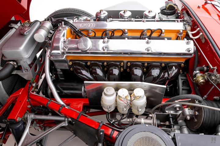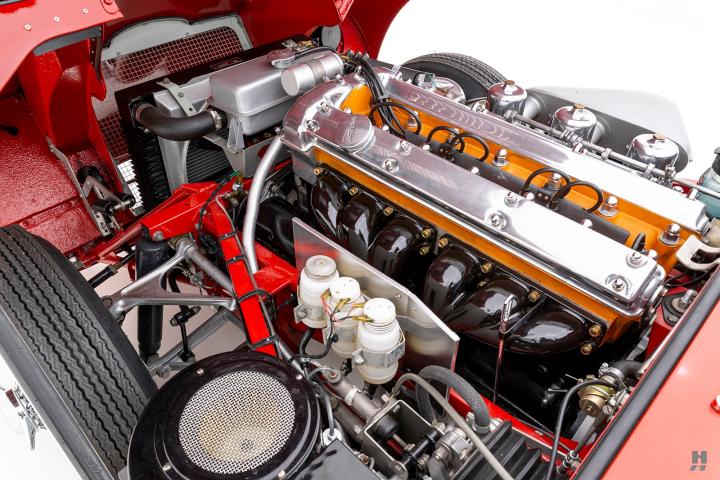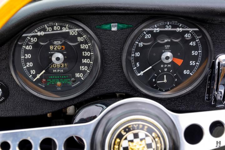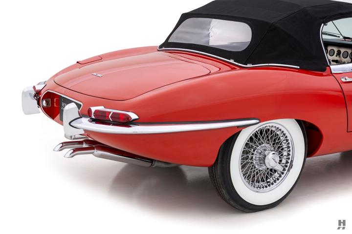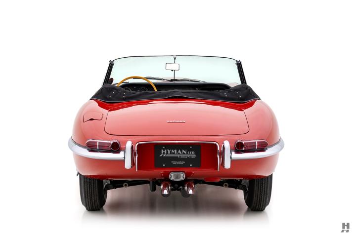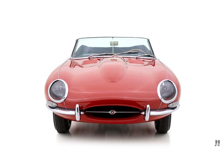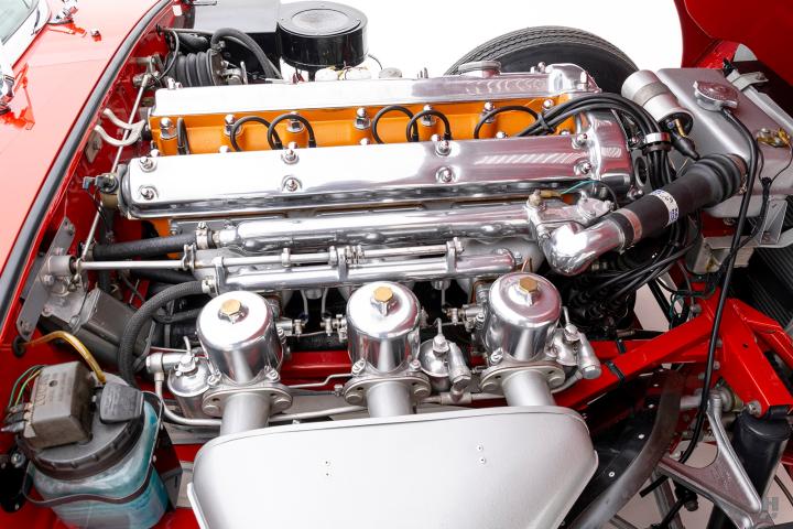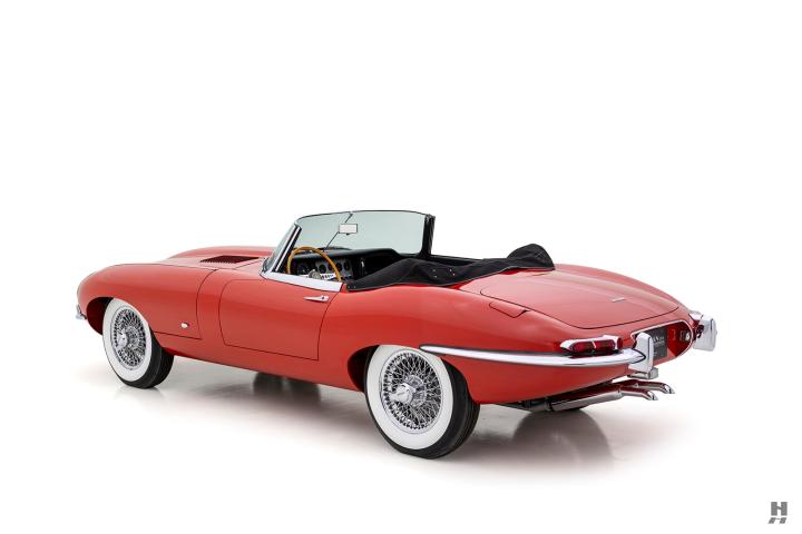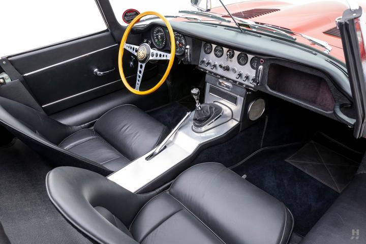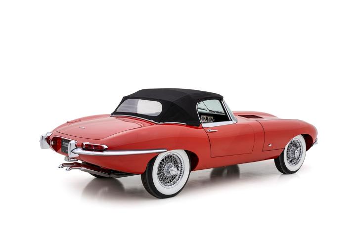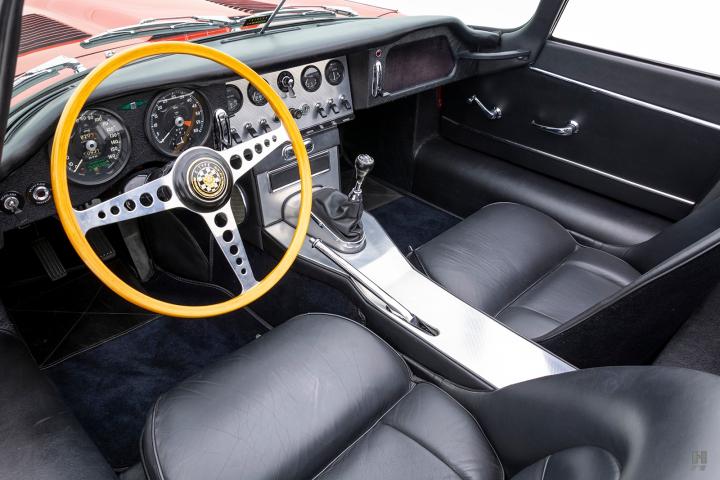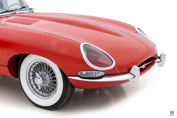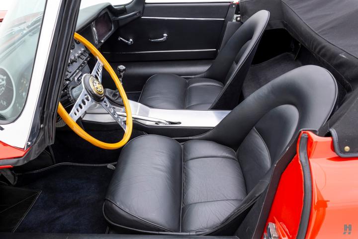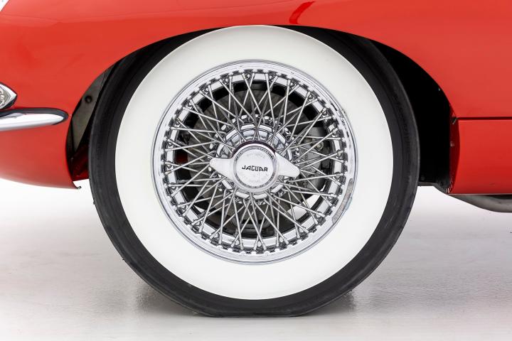 The body retains the all-imported outside bonnet locks โ operated via a T-handle wrench โ and the welded-in louvers are evident when you lift the bonnet. The build is set off by new wide whitewall tires, as often fitted to early E Types when new, but rarely seen today. The original, numbers-matching 3.8-liter XK engine resides in a gleaming engine bay, with beautifully polished cam covers, carburetor dashpots, and a proper pumpkin-orange cylinder head. New porcelain exhaust manifolds were fitted in preparation for sale, maintaining a near show-quality presentation. Similarly, the interior is beautifully finished in black leather on the proper early-type seats, showing only minimal signs of use.