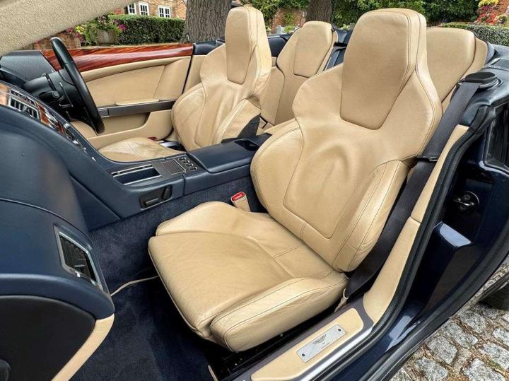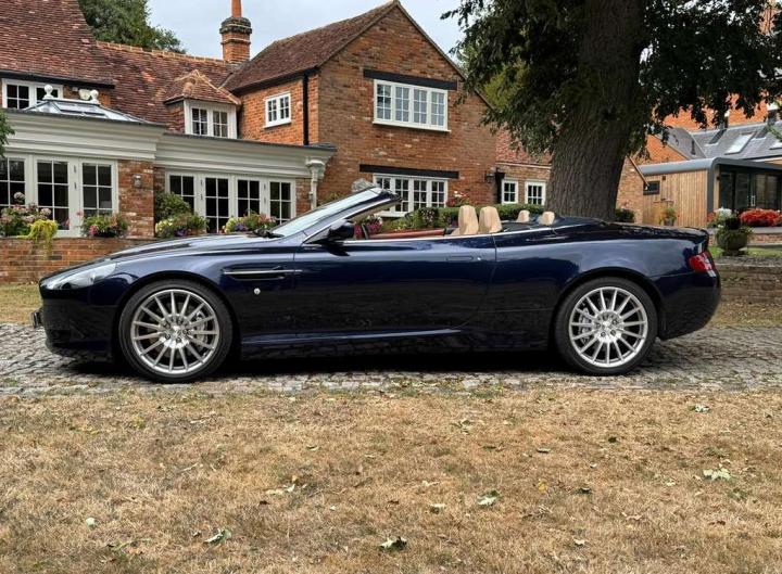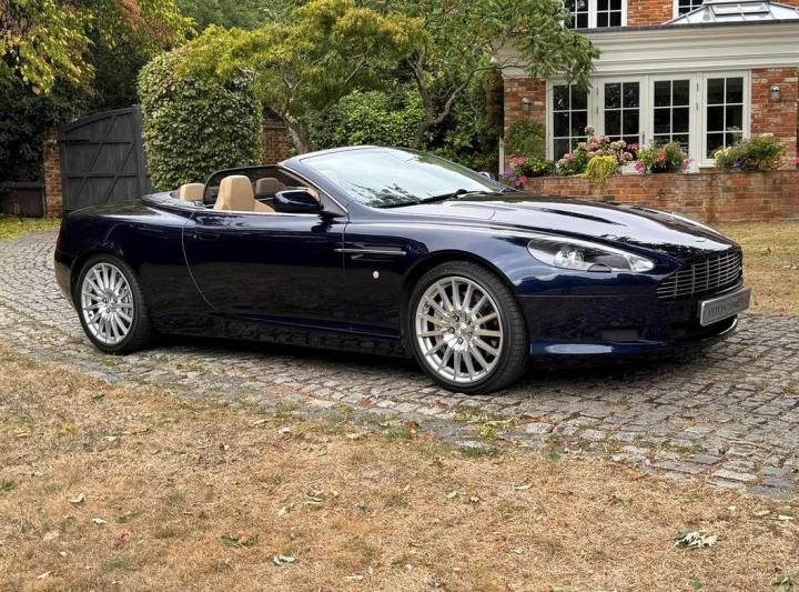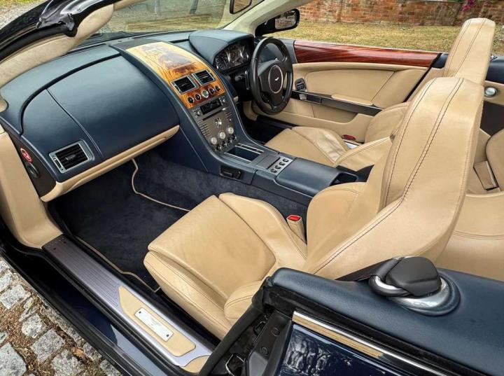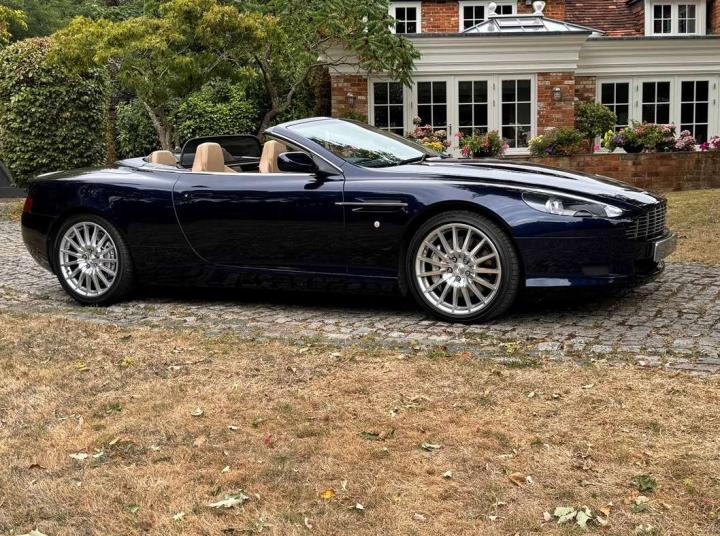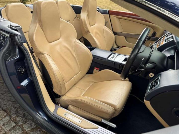 2006 Aston Marin DB9 Volante, finished in Midnight blue with contrasting Sandstorm hide interior with best quality dark blue Wilton carpet throughout. In addition, it has Walnut veneers to the centre console and door cappings, all of which are in lovely condition.. This is a beautiful, well-kept and well serviced example that has had only 3 previous keepers in 19 years. The mileage covered is just over 36,000, which is “Just Run-in” for the V12 5.9 litre Aston Engine and therefore still performing perfectly. The mileage is backed up by the DVLA MOT records, together with a stamped-up service book containing 15 service stamps and a number of corresponding service invoices. Fitted with the more desirable, paddle-shift automatic transmission making this car extremely easy to drive. It has the benefit of 19” multi spoke, sports alloy wheels shod with the correct Bridgestone Potenza speed rated tyres, all of which are in excellent condition. In addition, it has heated electric seats with lumbar support, Powerfold mirrors, fitted wind deflector, an indoor car cover, a battery charger, and an electric tyre inflator. This superb DB9, now represents exceptional value for money for one in this condition at only £31,950. It comes with a 6 month warranty for added peace of mind.