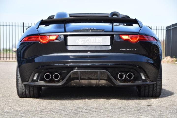 This is not just any F-Type! The original 5.0 liter V8 version already has a considerable amount of horsepower as standard, but in the Project 7 this was increased to 575 bhp. The roof was completely omitted and the windshield was lowered with 30 mm. Behind the driver, the distinctive “D-Type” hump was added and the front bumper, spoiler, diffuser and rims were modified. SVO developed a custom tuning for the 8-speed quickshift transmission and the electronic active diff, enabling acceleration from 0-60 mph in 3.9 seconds. The top speed is limited to 300 km/h . The aluminum body weighs 80 kg less than the standard F-Type and the tailgate, bonnet, louvres, power vents in the front wings and mirror caps are made of carbon.