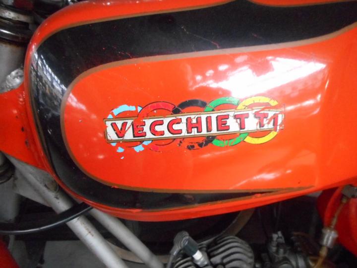 Een bijzondere brommer. Een oranje Vechietti. Hij staat hier te koop.Het frame is van een Negrini. Grote keus in motor- en bromfietsen in de Stolze Collectie!
