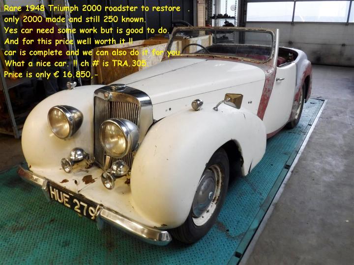 Zeldzame te restaureren 1948 Triumph 2000 roadster.Slechts 2000 van gemaakt en nog 250 bekend. Ja, deze auto heeft wat werk, maar is goed te doen.En voor deze prijs goed de moeite waard. Auto is compleet en eventueel kunnen wij de restauratie ook voor u doen. Wat een mooie auto !! Chassis nummer is TRA 305. Grote keus in ECHTE klassiekers in de Stolze Collectie, van project tot perfect !