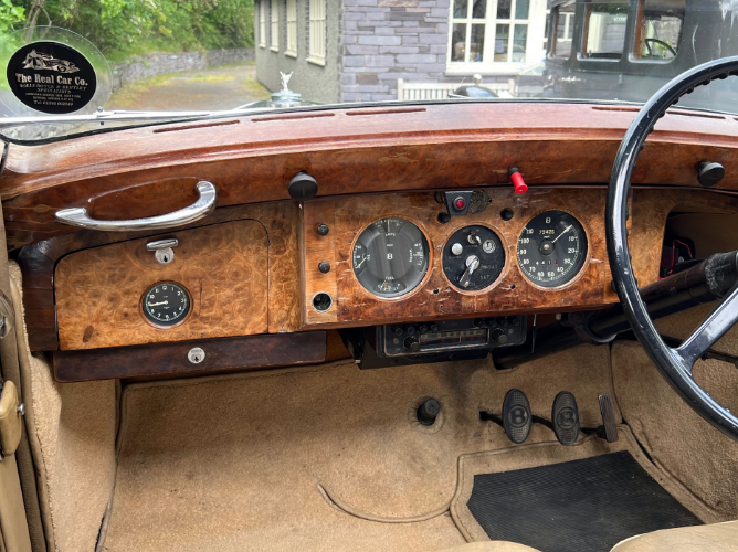 A good, sound and very useable example of an early MKVI finished in black with beige leather interior which – being an early car – is of the plain, non-pleated design, with two armrests to each front seat. This, together with inertia reel seatbelts to the front and a nicely-working sliding sunroof make the inside a very nice place to be! We have a file of maintenance and repair invoices totalling about £39,000 since the 1980s, and the car has covered about 2,300 miles in the hands of the last owner since he bought it from us in 2016. A comprehensive service was carried out in 2022 costing £2,600, since when just 100 miles have been covered. We feel that the car would benefit from a certain amount of cleaning and cosmetic improvement, but this is by no means urgent, and more importantly, the chassis, underbody and coachwork are all reassuringly sound. Running and driving nicely, equipped with a well-suited set of Avon Turbosteel tyres, correct headlights, centre spotlight, etc, and offered prepared and newly MoT tested.