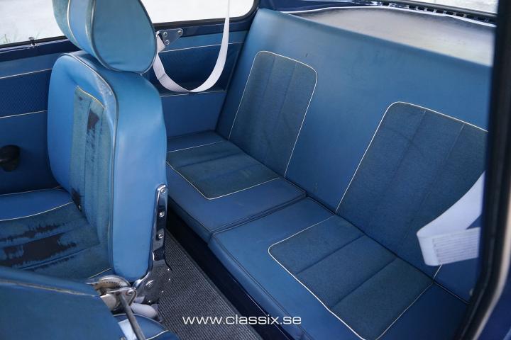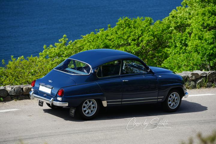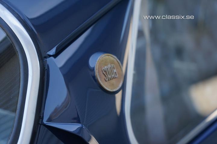 Exterior: The majority of the SAAB 96 Sport cars were or have later been painted red, most likely since SAAB became famous from their racing success and the cars they raced were red. What makes this SAAB 96 Sport stand out is that it is a beautiful dark blue original color. The car was restored around 2007, and the paint still looks very nice today. It is fitted with Ronal wheels and Toyo tires that suit the SAAB cars very well. The underneath of the car was painted with a black stone chip protection, and it is today 100% rust-free. All wearing parts like bushings and joints were replaced during the restoration, and the car has been driven 1,400 km since.