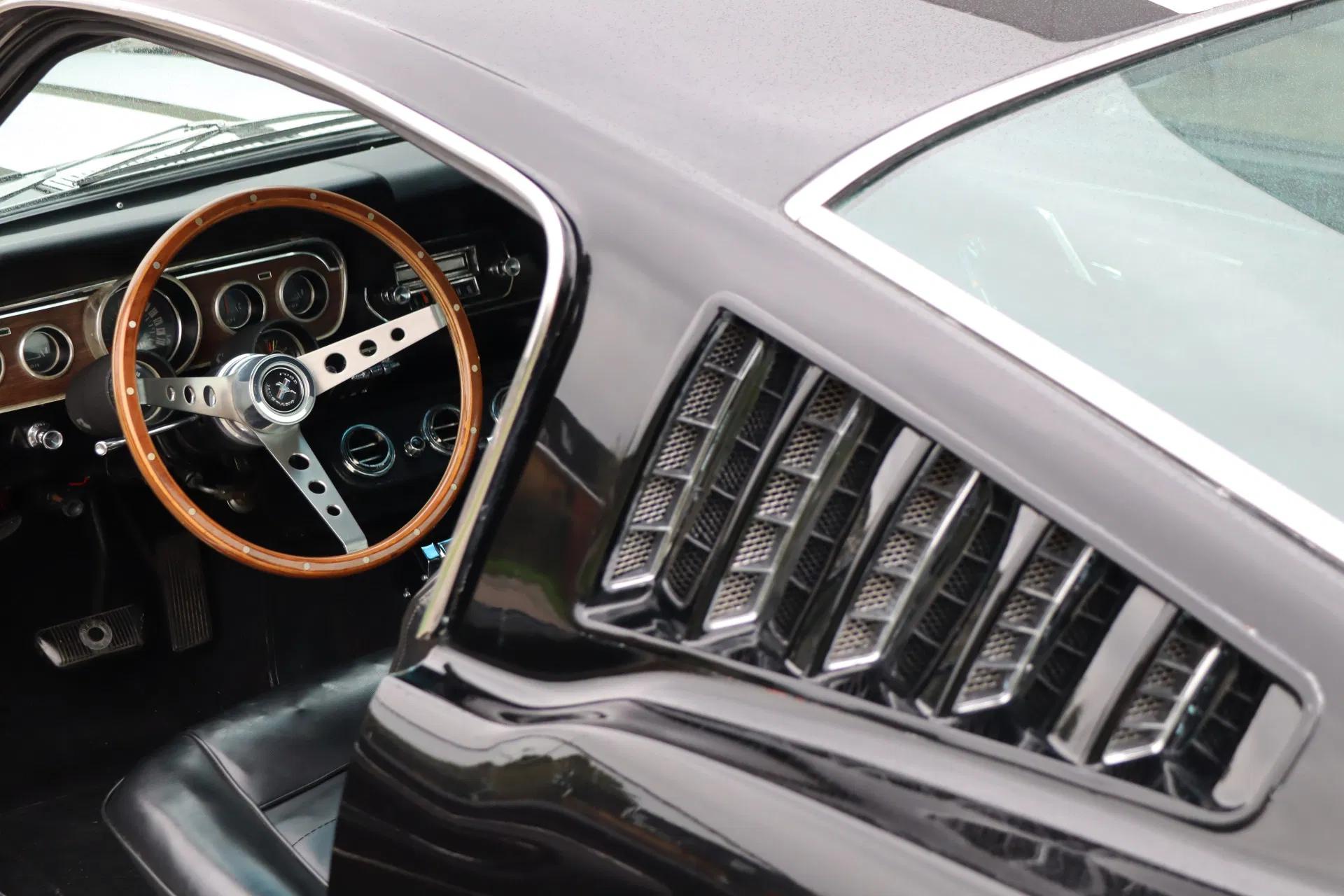 De 1966 Fastback is waarschijnlijk de mooiste Mustang ooit gebouwd en wordt door veel liefhebbers geroemd. Dit is exemplaar is zeer fraai en stoer uitgevoerd: zwart lakwerk ('Raven') met witte racestrepen. Het lakwerk heeft een diepe glans en heeft slechts minimale gebruikerssporen. Velgen maken de auto, en dus zijn fraaie 15" 'American Racing' velgen gemonteerd. De passingen van de carrosserie zijn mooi en het chroomwerk verkeert in goede staat. De ramen rondom zijn getint. De voorruit is vernieuwd en voorzien van een zonnefilter.
