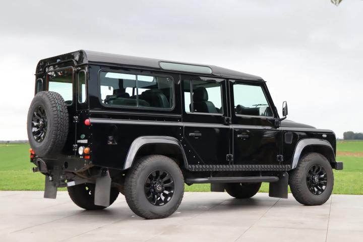 This Defender has a beautiful and rugged appearance, finished in all black. The deep black colour has a beautiful shine and the visual condition is very good with only minimal signs of wear. The 15-inch alloy wheels are in top condition. Running boards on the sides give the car an extra robust look. At the rear, there is a step for the rear passengers, a tow bar and a spare wheel. The lights and rubbers are in good condition.