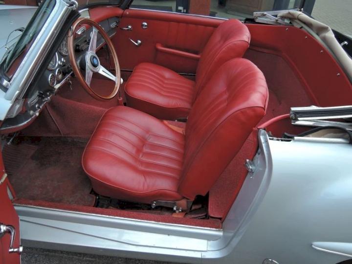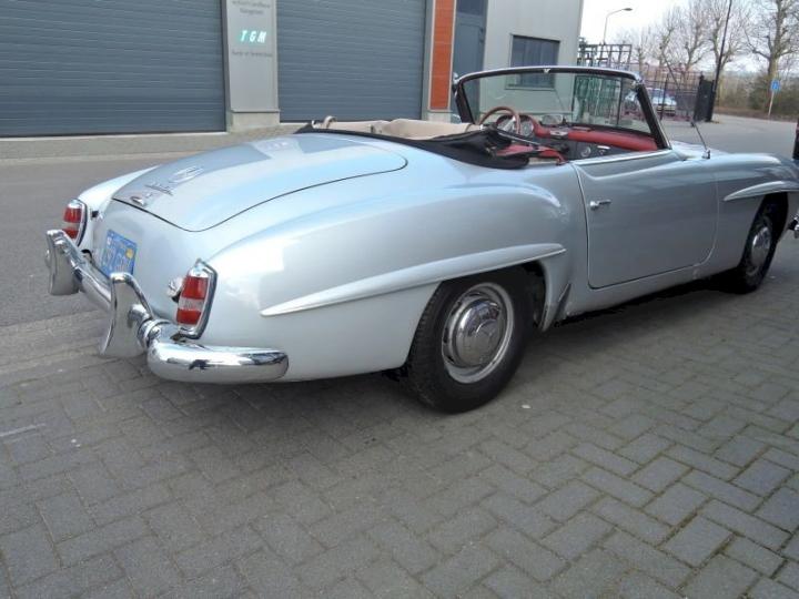 Betreft een redelijk exemplaar deze late versie 190SL, een auto met een leuk uiterlijk, het lakwerk van origine donkergrijs 190G is in het verleden gewijzigd in de kleur zilver metallic 180G en is in een redelijk conditie zo ook het chroomwerk is netjes en past goed, de voorruit omranding mag vroeg of laat verchroomd worden, het rood leder interieur met passend tapijt is in een goede staat, softtop is in een goede conditie, qua body optisch goed echter o.a de vloerbodem-delen hebben aandacht nodig, nieuwe bodem delen zijn reeds aanwezig en gaan mee met de koop, technisch en motorisch loopt en rijdt deze 190SL cabriolet naar behoren, de kwetsbare Solex carburateurs zijn in het verleden vervangen in Mikuni met behoud van luchtfilter en aanzuigbuis, het motor onder blok is in het verleden vervangen door de juiste ruil motor af fabriek, het bovengedeelte met name de cilinderkop is nog origineel.