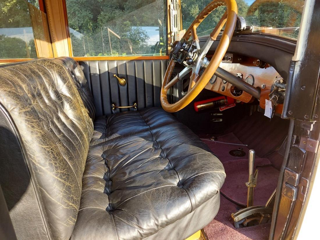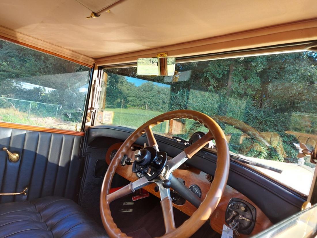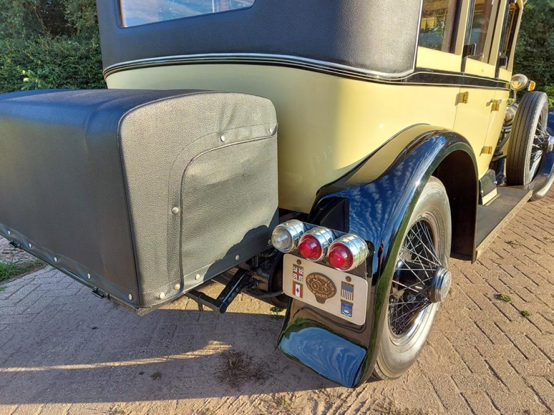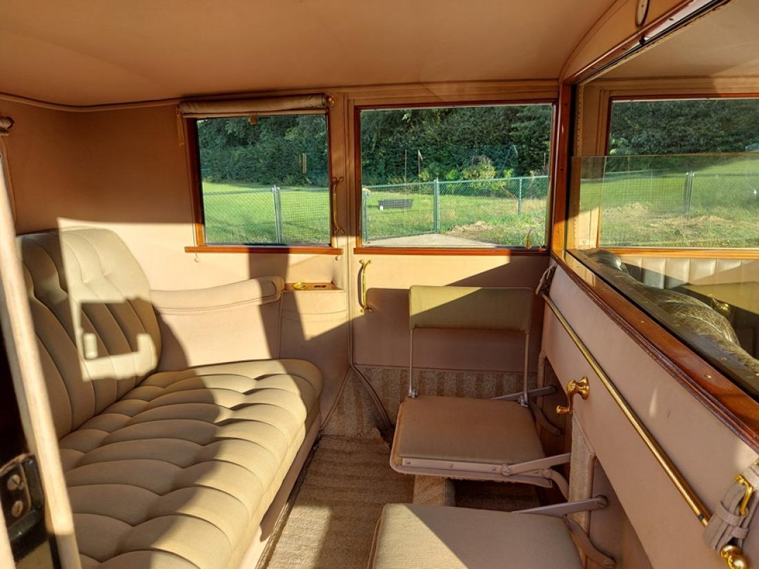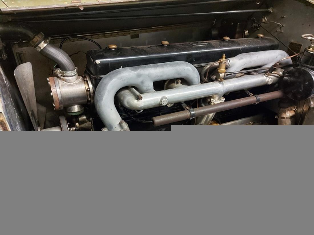 The body is a Brewster Rowsdale limousine, similar tothe more common Lonsdale, but with a dropping division rather than the two-panel sliding type, making for better communication between driver and passengers. Occassional seats fold out from the division partition. It is the only such bodied listed in the 1997 RROC Directory. The radiator, headlamps and side lamps are shown with protective covers on them which protect them from getting rain spotted en route to meets, thus decreasingtime and effort spent in polishing.